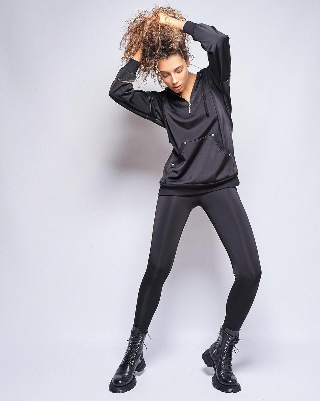 Худі має зручну кишеню-кенгуру, блискавку та м’який внутрішній шар із хутра, що дарує тепло у прохолодні дні. Легінси виконані з еластичного трикотажу з боковими вставками з екошкіри, які підкреслюють фігуру та додають образу сучасності.